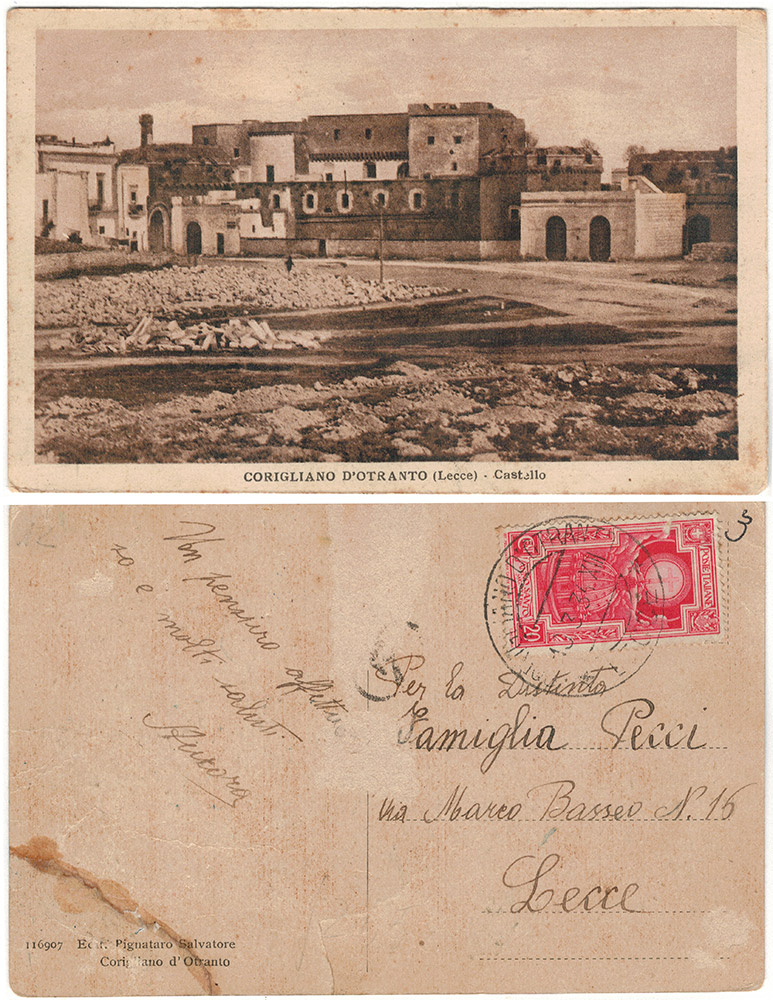 Corigliano D’Otranto, cartolina viaggiata, Piazza Vittoria, denominata anche Largo fiera e “Pezzumero”, 1930