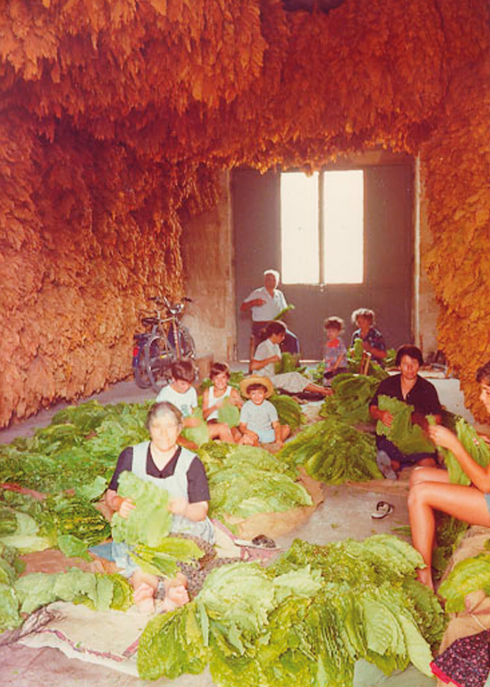 The Tundo family stringing tobacco leaves (‘nfilatura’). 1980s. Zollino.